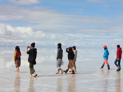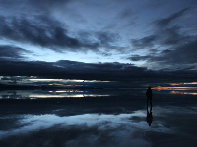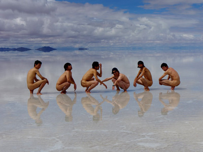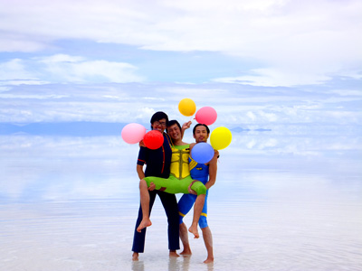 早朝明るくなりだす時間帯のウユニは、風が完全に凪いでいて、まさに鏡面と呼ぶにふさわしい。めっちゃ寒いけど、ずーっとそれを眺めていられるな。もう何を撮っても絵になるんだぜ。 日が昇って朝飯食べたら、お迎えが来るまでは完全自由時間。この日の昼はウルトラベストコンディションだったこともあり、とりあえず全裸になってみたり、とりあえず変な衣装着てみたり、トリック写真に挑戦してみたり、一昨日とやってることは全く変わらんのだが、とにかく人数も違うし、すっかり関係が出来上がっているため撮れる写真が断然熱い。 ![]() ↑朝の鏡具合は凄い。 ![]() ↑みんなでどこまでも歩いていく。 ![]() ↑覚えておられるだろうか、泥棒市のコスチュームを。 まぁでもピークタイムは間違いなく全裸タイムだ。全裸の俺とA君で、「このメンバーで全裸にならなかったら一生後悔するから!」と皆を説得、その全裸説得シーンは絵的に最高にかっこよかったと思う。女子陣に、ちょっと服持っててって服とか下着とか持ってもらってみんなで全裸で疾走。天空の大地を駆ける我々は、さながら雲の切れ間を縫って飛び遊ぶ天使とでも言おうか、宗教画のような厳かさがあったに違いない。 ![]() ↑美しすぎるぜ……。 今日、このウユニを去ってしまうからな。やれることはやっておかないとな。 美景観果てなき お迎えのランクルが来た後も散々ウユニの鏡面世界を堪能して、町へ向かう。今日の夜行バスでラパスに戻らないと、俺たちは日本へ帰れなくなってしまう。だが。 「なあ、A君。今日コンディションいいから、夕日、いけるんじゃねーか」 「……かもな」 今日は、恐らく夕焼けが見れる、かもしれない。そうなのだ。連日俺たちは、昼には間違いなく最高のコンディションを得ていた。だが実は、夕方になると雲が厚くなってしまっていたため、まだ夕焼けが見れていなかったのだ。 一度町に戻って、またランクルをチャーターして戻るとなると、夜行バスには確実に乗れなくなる。だが、今日はたまたま、深夜0時に列車がウユニを経由する曜日。雨季の鉄道はよく止まってしまうし、実際に一昨日の列車も土砂崩れの影響で運休していたらしいのだが、今日は天気もいいし、もし列車が動いていれば……!! |