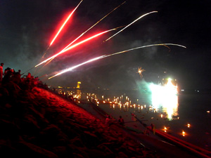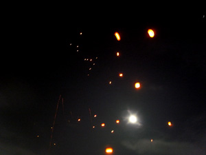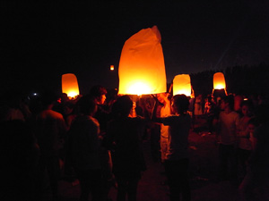 ナンプラーと甘みの効いた美味なラオチャーハンを食べ過ぎ部屋で昼寝、もとい夕寝。しかし同宿に泊まっているタイ人の旅行者たちとメコンの祭を見に行こうと誘われていたため、夜8時頃に起床して川に向かう。外は相変わらずの人混みで、昼以上に人が集まってきているように思える。露店の並びから川へと向かう道はまさに押し合いへし合いの一種のパニック状態だ。お祭り好きな欧米人観光者の姿もちらほら見える。そして空には赤橙色の星が多数瞬き……、しかしあれは星にしては明るすぎないだろうか。それとも飛行機か何かだろうか。 メコンでは祭のクライマックスとばかりに灯篭流しが行われていた。静寂など認めないとばかりにロケット花火が次々と川に向けて打ち出され、若者たちが笑顔で騒いでいる。そして驚いたのは、空に向けても灯篭を放っていたことだ。簡易版の熱気球とでも言おうか、日本だと安全上の問題から間違いなく許可が下りないであろうその熱灯篭が数多空を駆けている。先ほど星か飛行機かと錯覚したものはすべてこの灯篭だったのだ。 ![]() ↑川への灯篭流し。 ![]() ↑空への灯篭流し。 ![]() ↑どこまで飛んでいくのだろうか。 空を駆ける灯篭流し……なんて幻想的なのだろうか。のちにタイ人旅行者たちと話をしていると、タイでも同じような熱灯篭の祭があるらしい。日本じゃとてもあんな危ないことは許されないなあと言うと、「そうだろうね」と彼女は笑った。実際人混みに向けて落ちてくる灯篭も数機あった。各々の責任で、といったアバウトが許される空気は良いものがある。実際これだけの人間が密集している中、警備や人員整理の担当者の姿はまったく見えない。激しい熱にあてられた僕は、浮ついた心地のまま宿へ帰った。しかし偶然とはいえ本当に良いものを見た。この部屋には南京虫もいないし、今夜は気持ちよく眠れそうだ。 そして良い気分でホットシャワーを浴びているさなか停電となり、暗闇の中、水シャワーを浴びることになってしまったことも今となってはいい思い出だ。こういう落とし穴がいかにもアジアである。 |